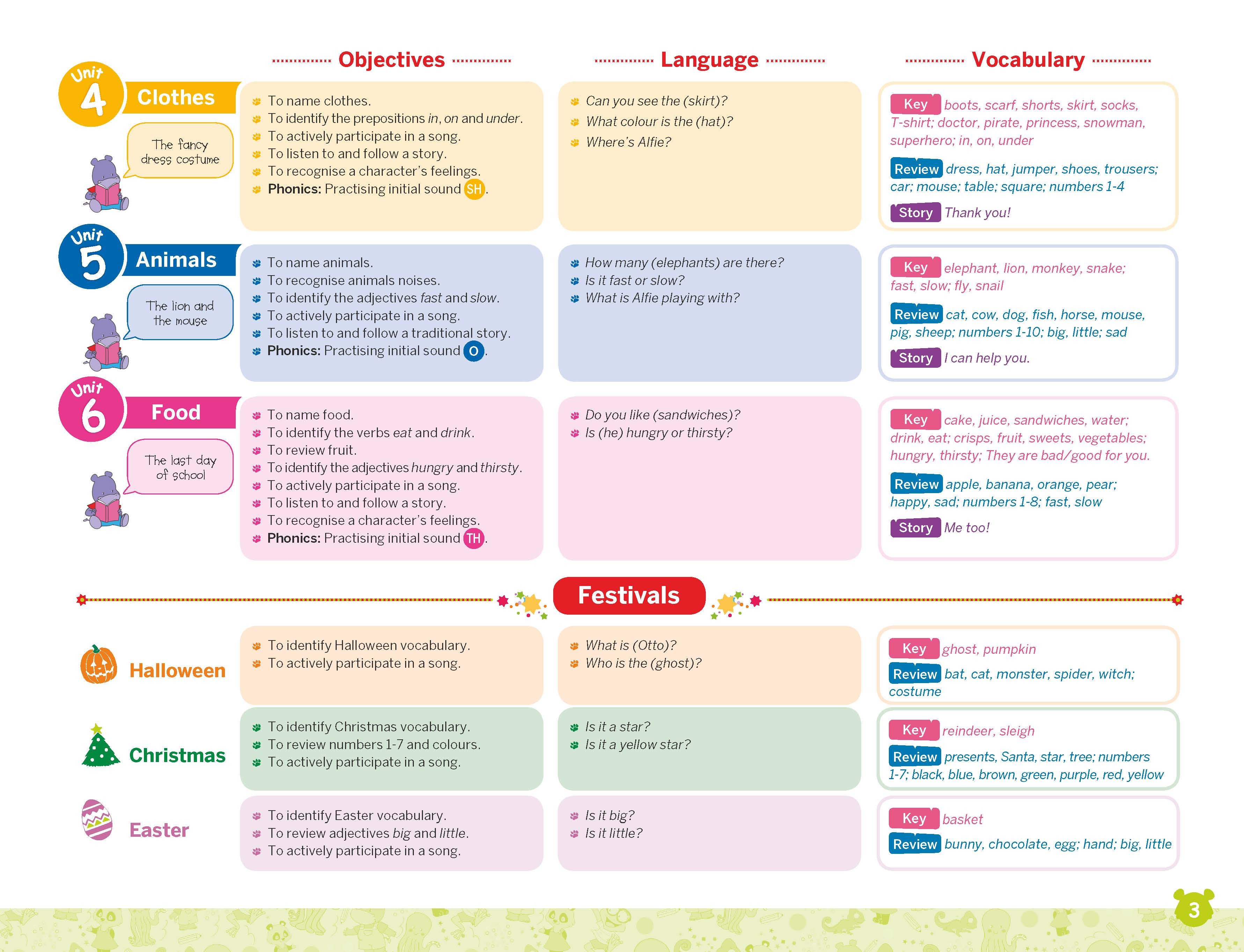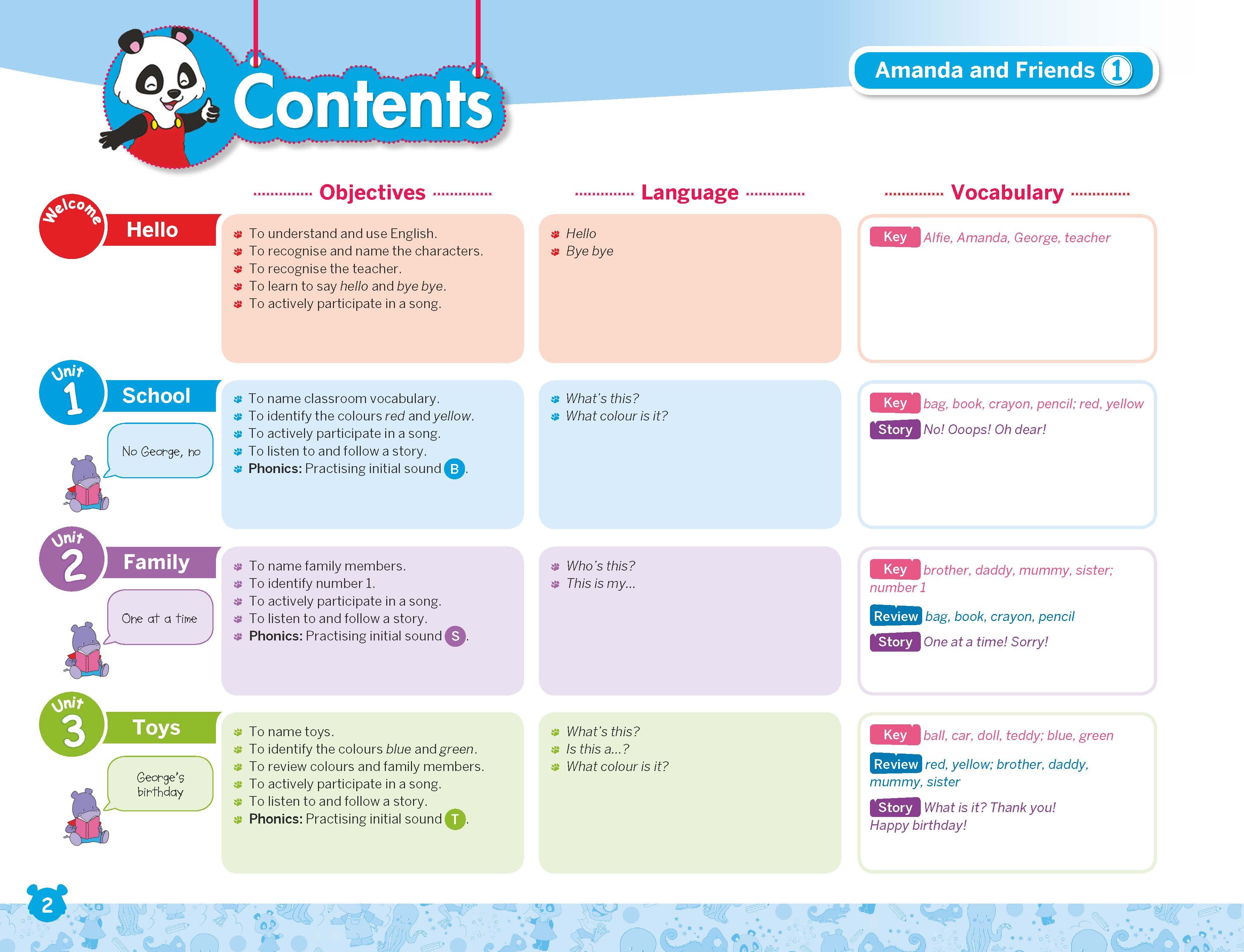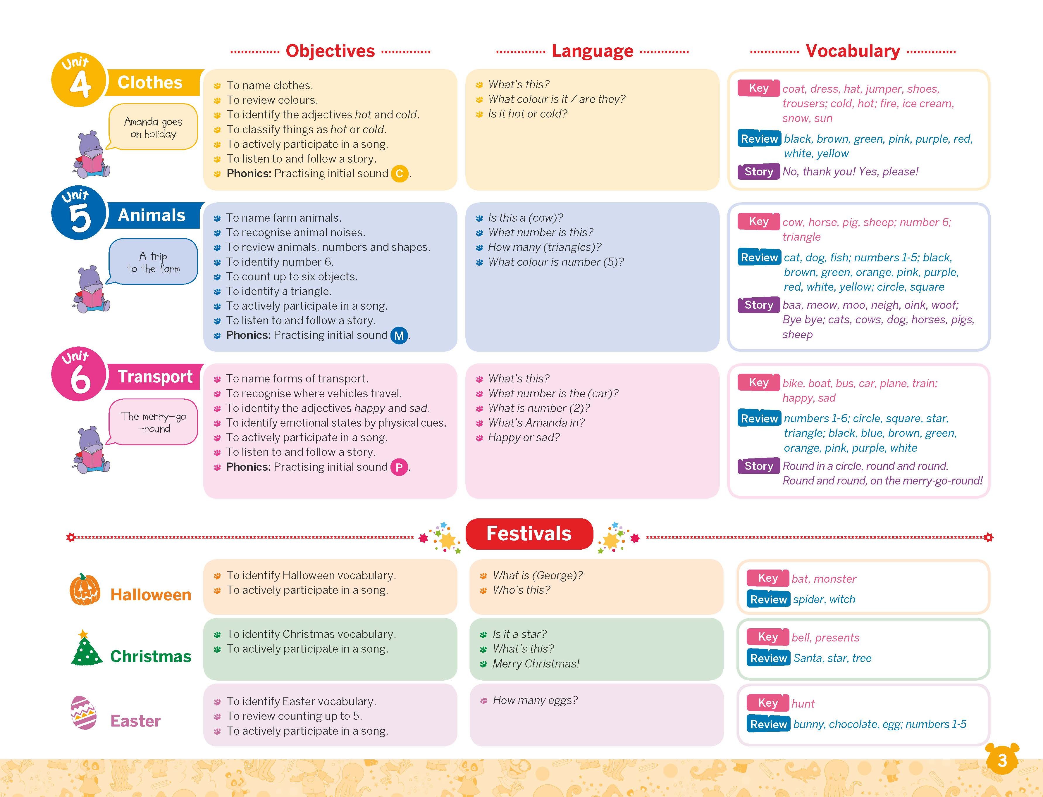 The learning is topic based, with key content integrated into each unit. The content chosen is relevant to the children, appropriate for their age and their interests. Moving through the course they will gradually increase their exposure to English