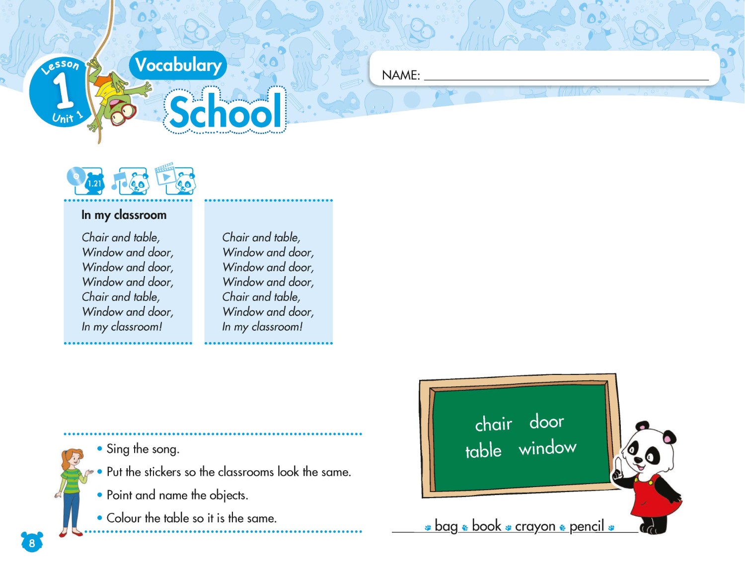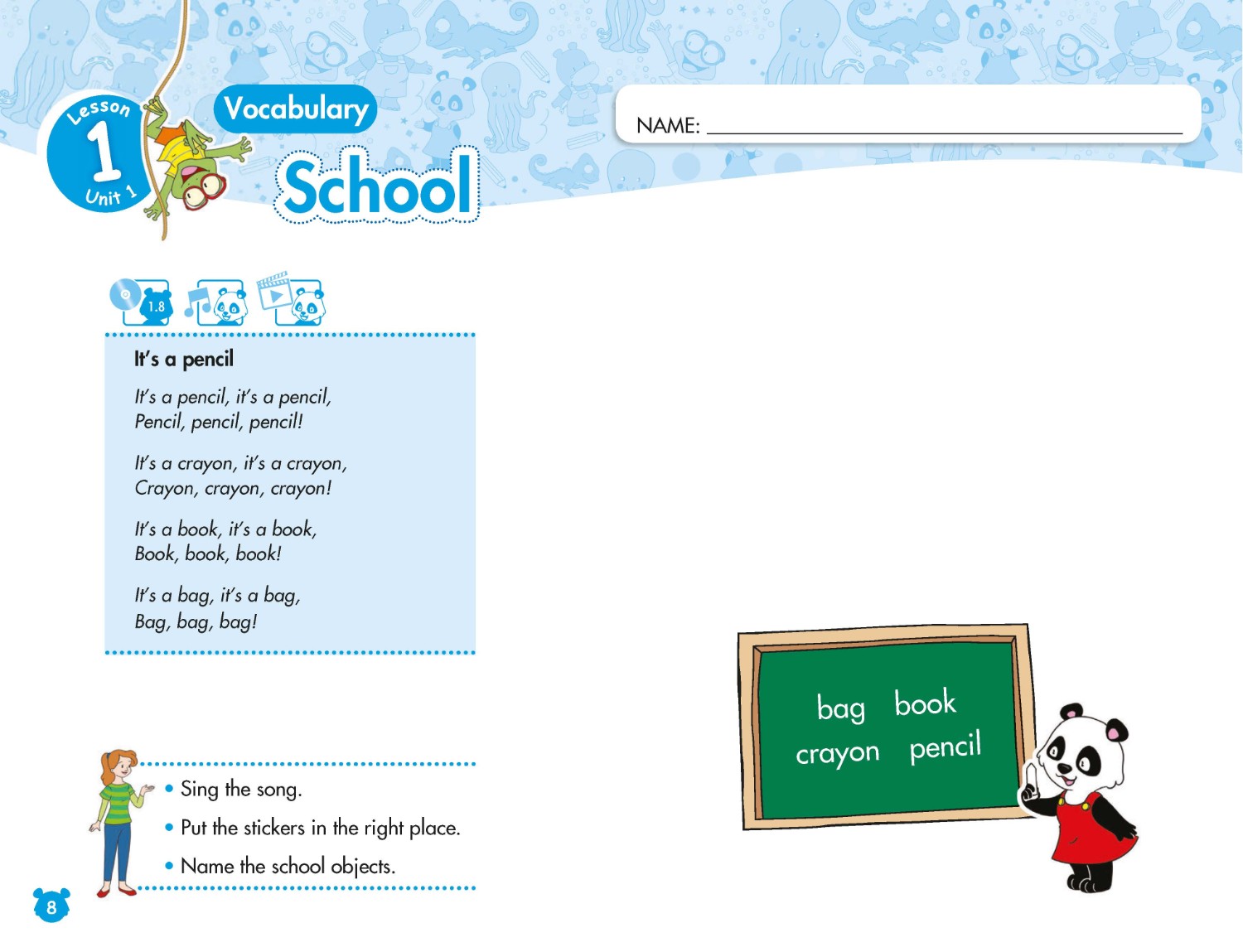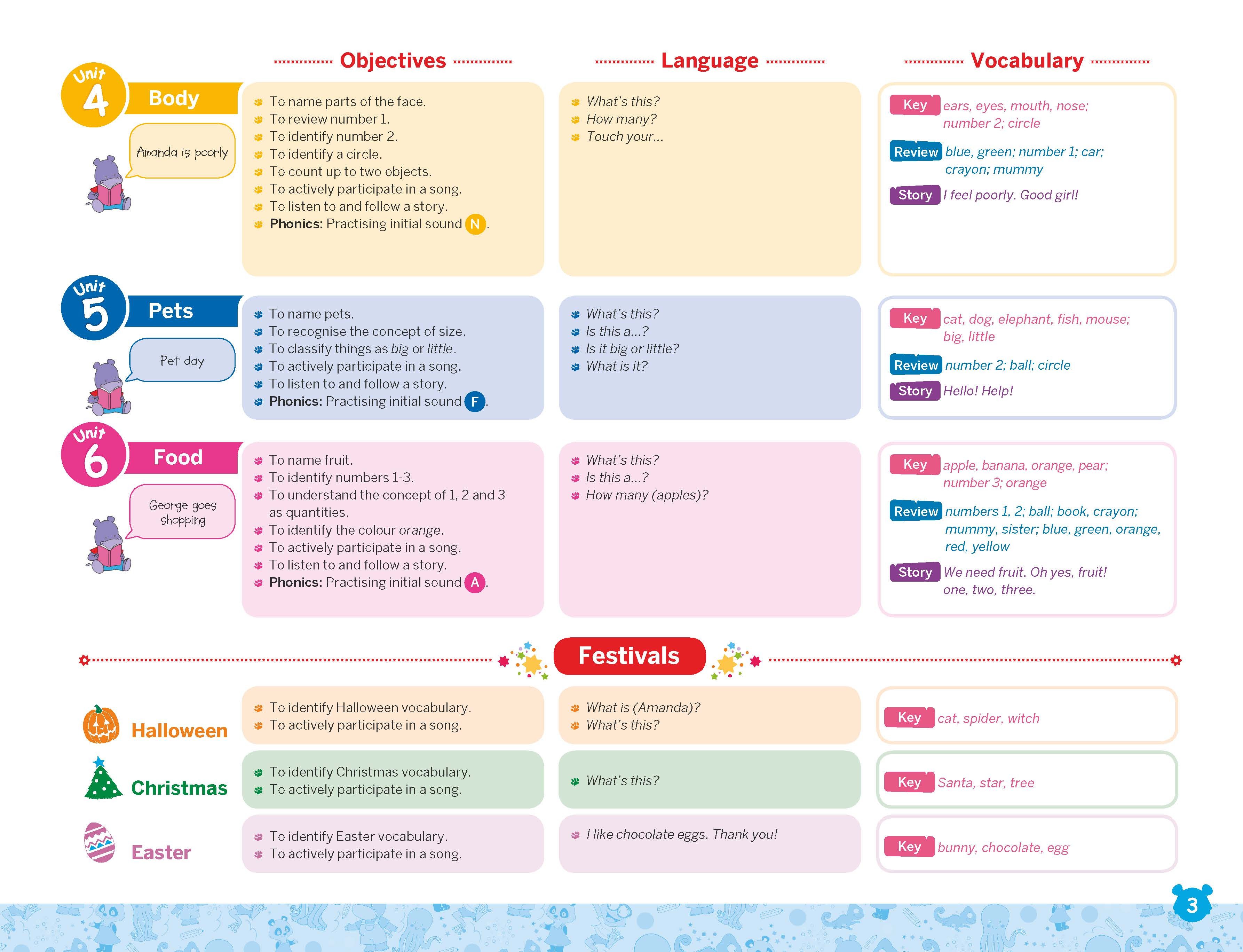 The learning is topic based, with key content integrated into each unit. The content chosen is relevant to the children, appropriate for their age and their interests. Moving through the course they will gradually increase their exposure to English