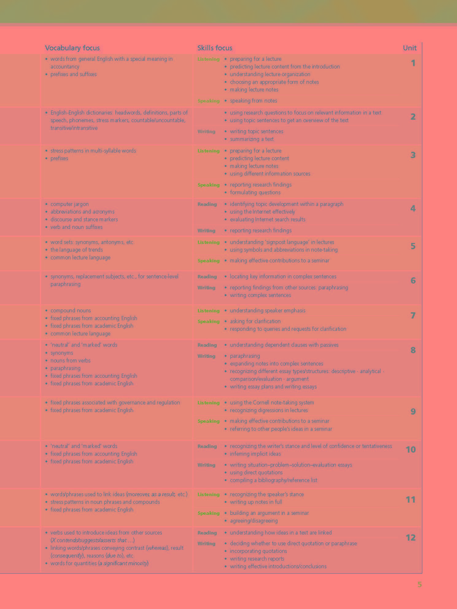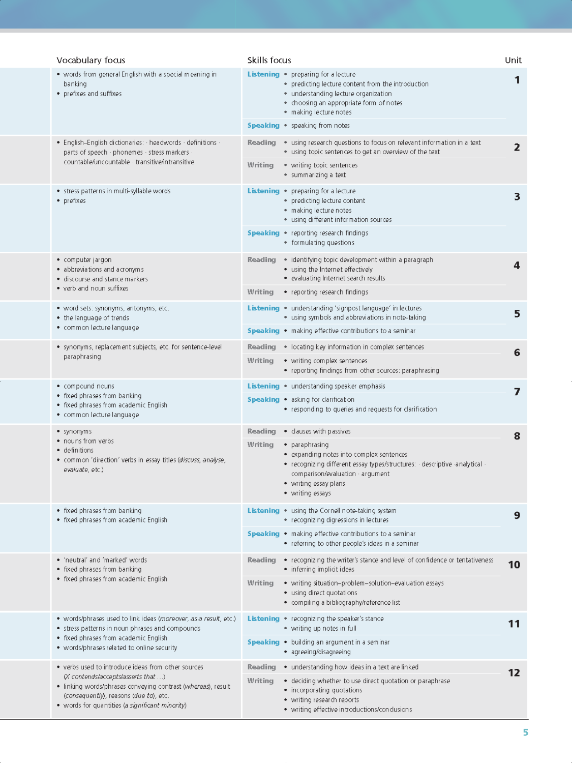 Speaking: Làm thế nào để tham gia hiệu quả vào các bối cảnh học thuật khác nhau, bao gồm việc phát triển một lập luận trong một bài thuyết trình ngắn, tham gia thảo luận nhóm và đặt câu hỏi trong các bài giảng.