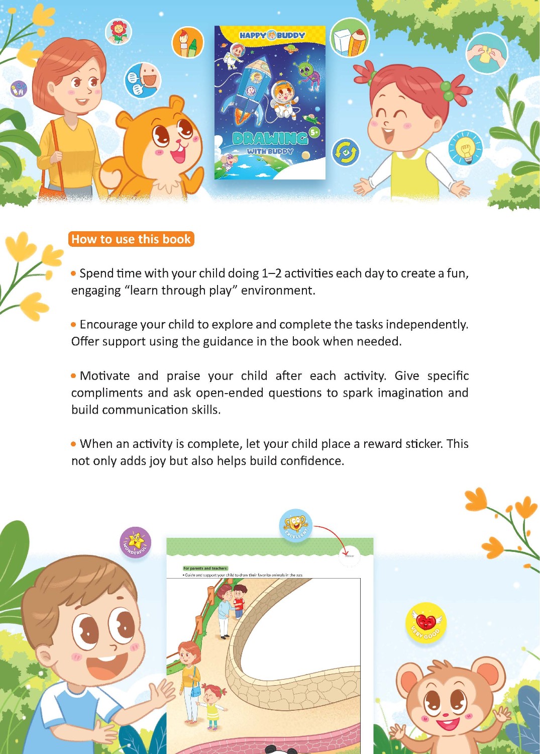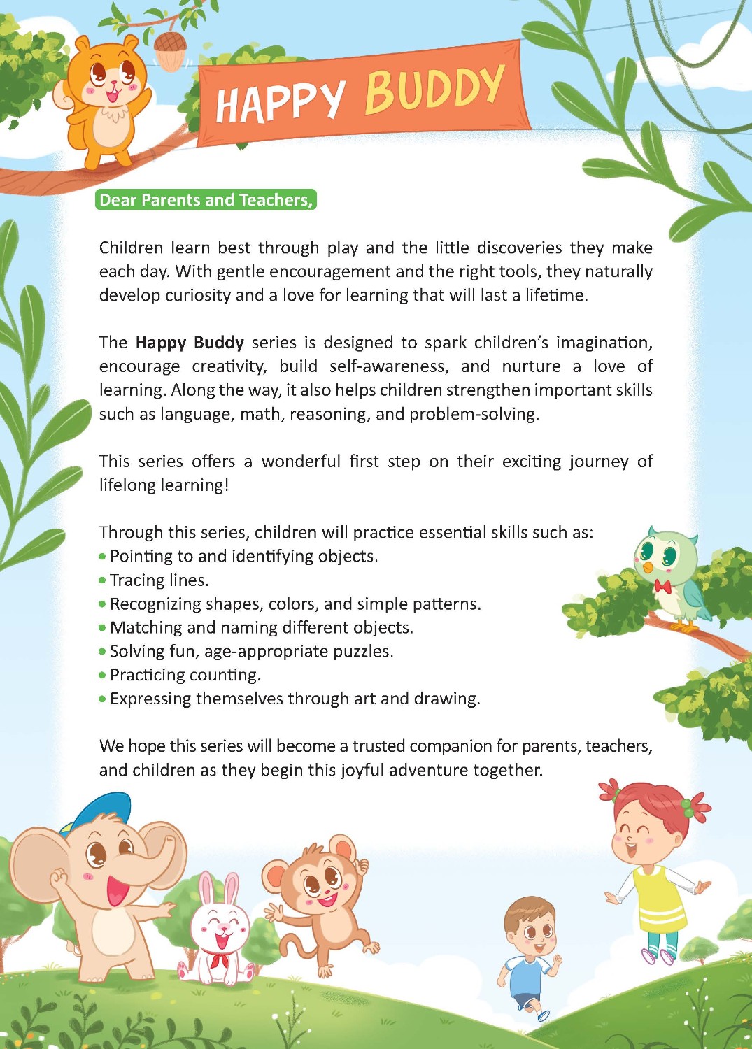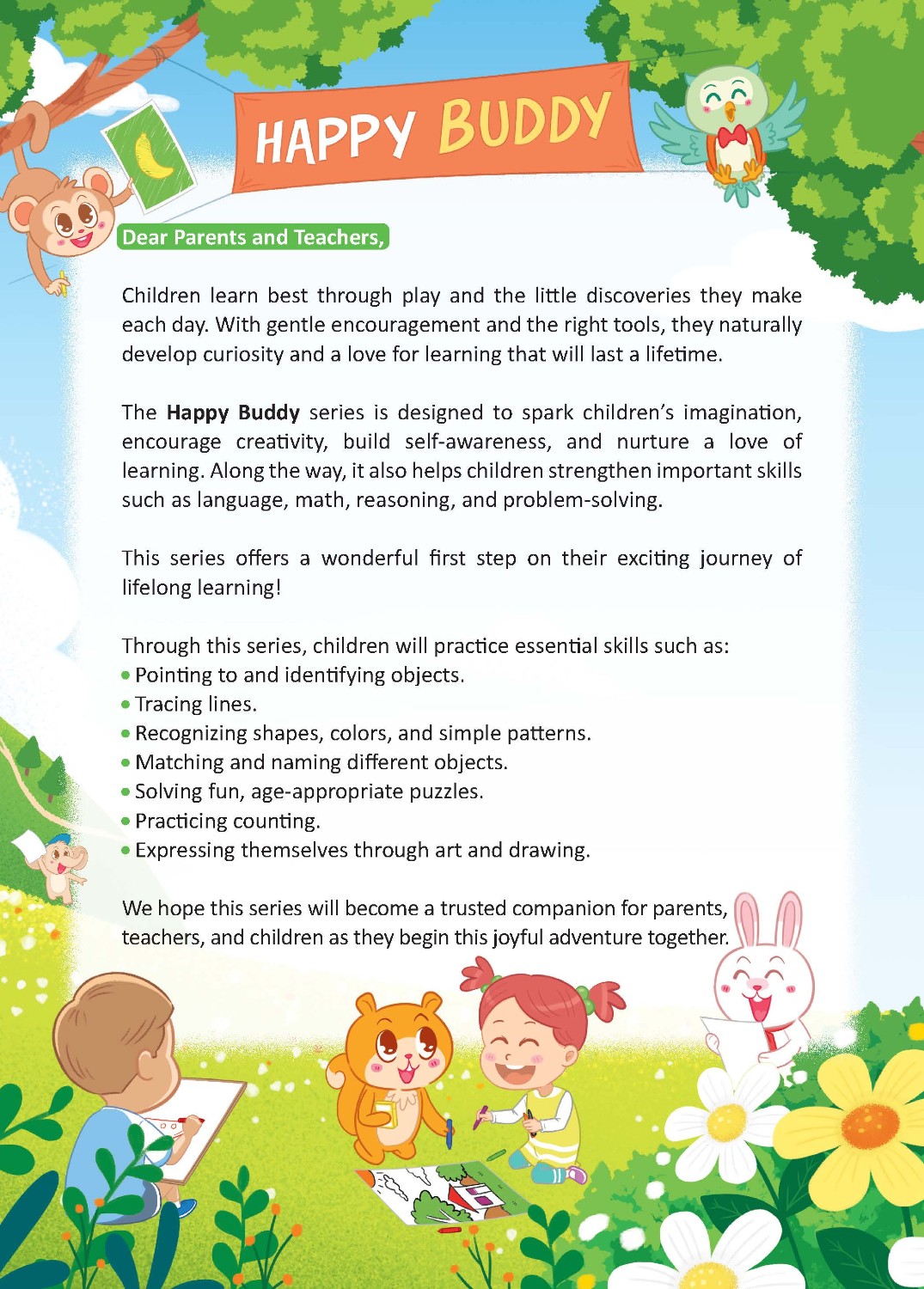 Bộ sách Happy Buddy được thiết kế để khơi dậy trí tưởng tượng của trẻ, khuyến khích sự sáng tạo, xây dựng ý thức về bản thân (self-awareness), và nuôi dưỡng tình yêu học hỏi. Đồng thời, bộ sách cũng giúp trẻ tăng cường các kỹ năng quan trọng như ngôn ngữ, toán học, lý luận (suy luận), và giải quyết vấn đề.
