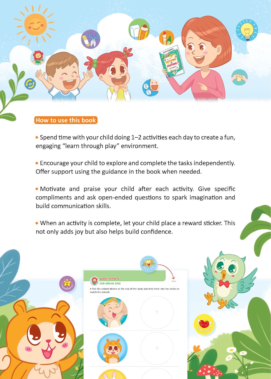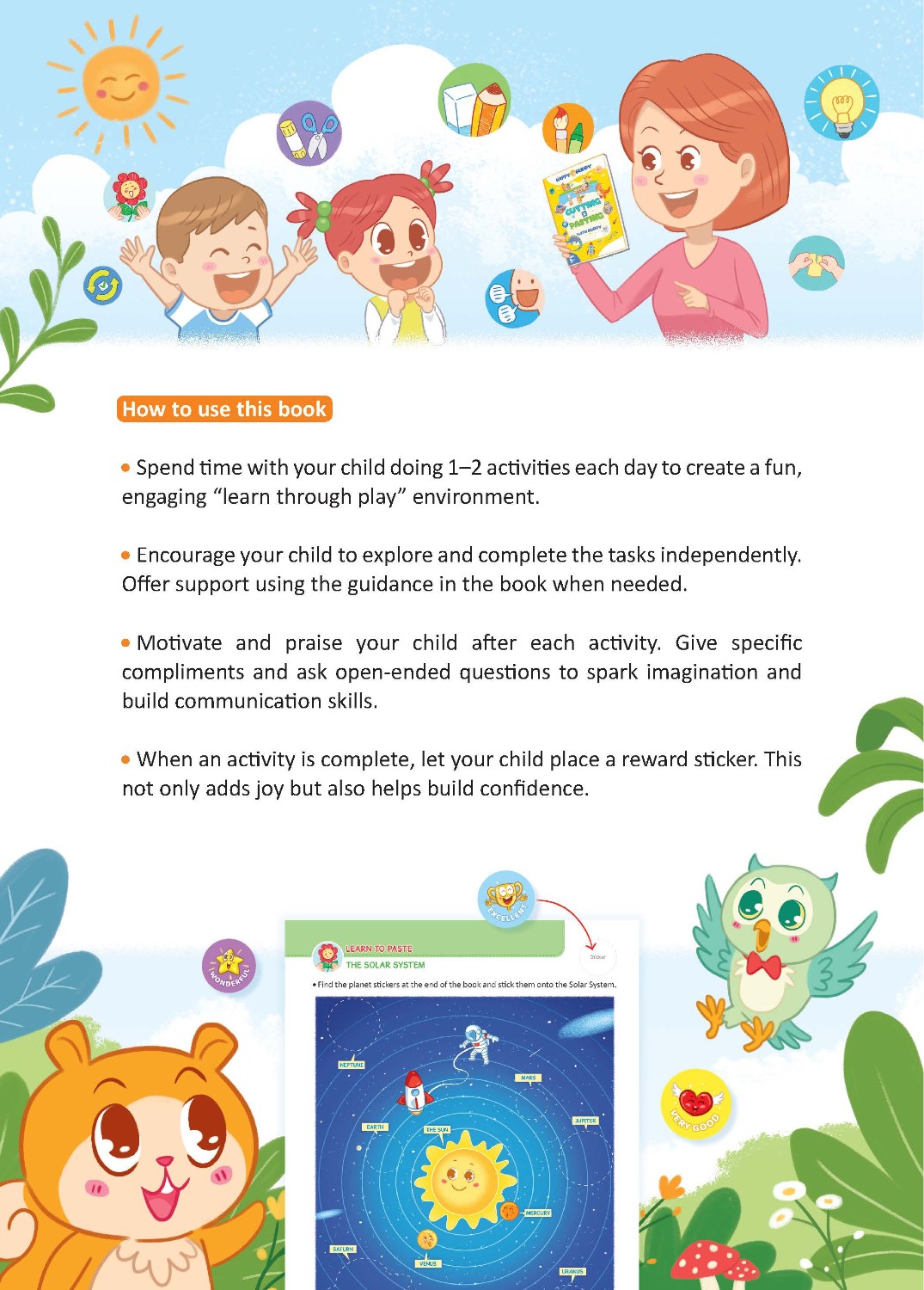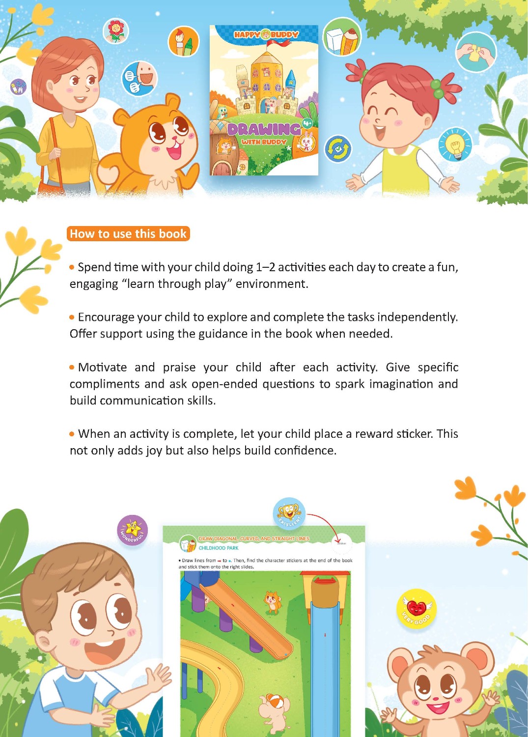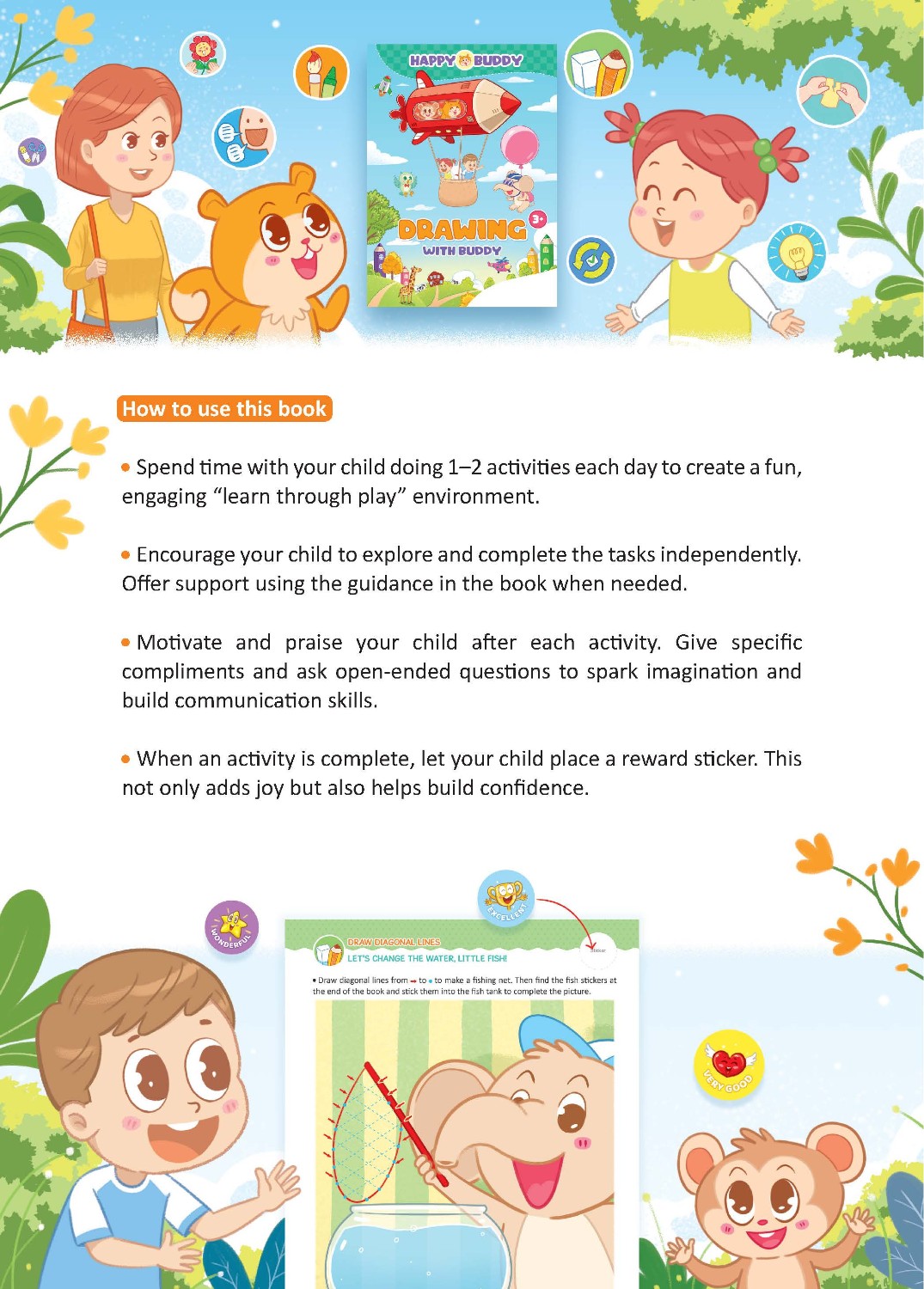 Bộ sách Happy Buddy được thiết kế để khơi dậy trí tưởng tượng của trẻ, khuyến khích sự sáng tạo, xây dựng ý thức về bản thân (self-awareness), và nuôi dưỡng tình yêu học hỏi. Đồng thời, bộ sách cũng giúp trẻ tăng cường các kỹ năng quan trọng như ngôn ngữ, toán học, lý luận (suy luận), và giải quyết vấn đề.