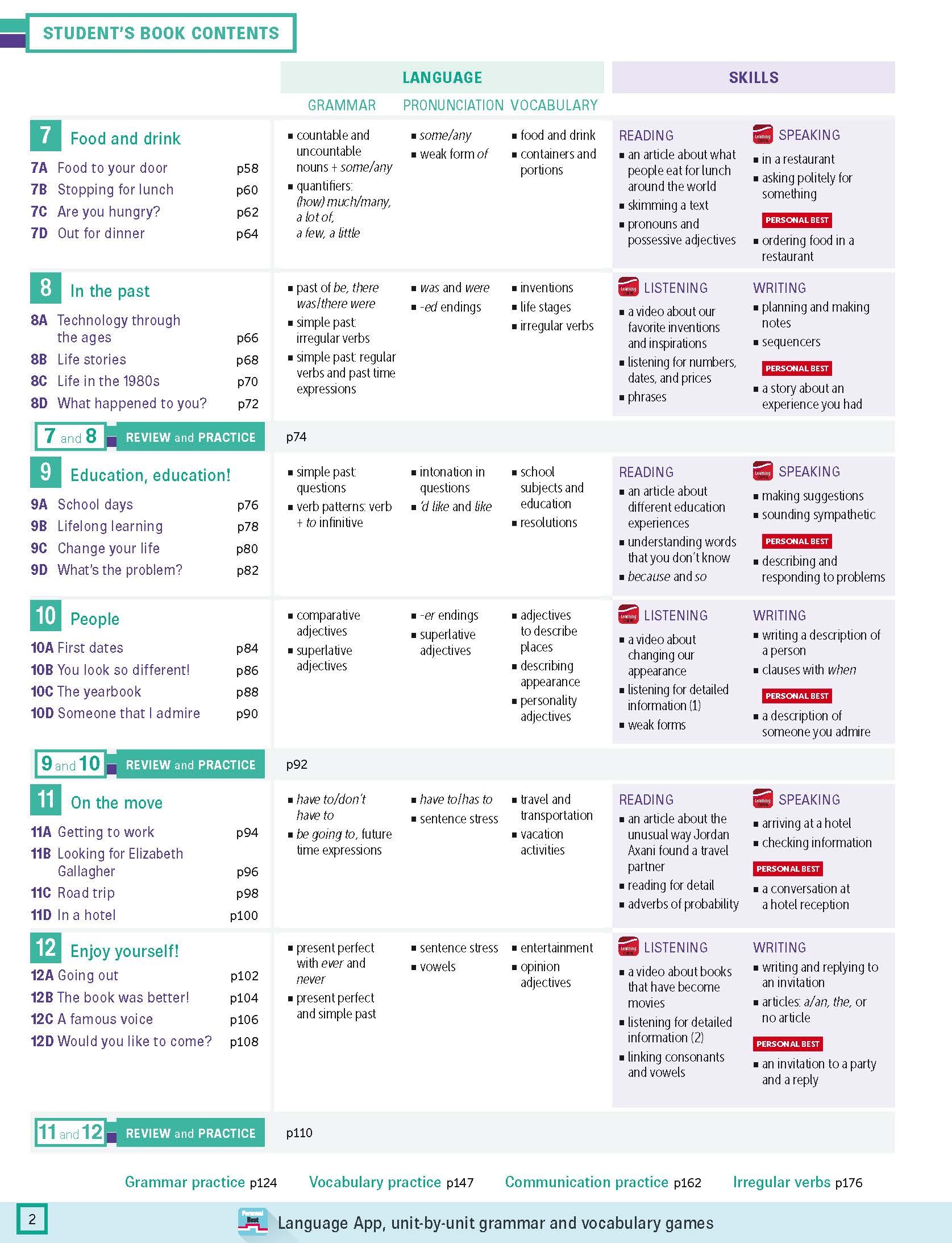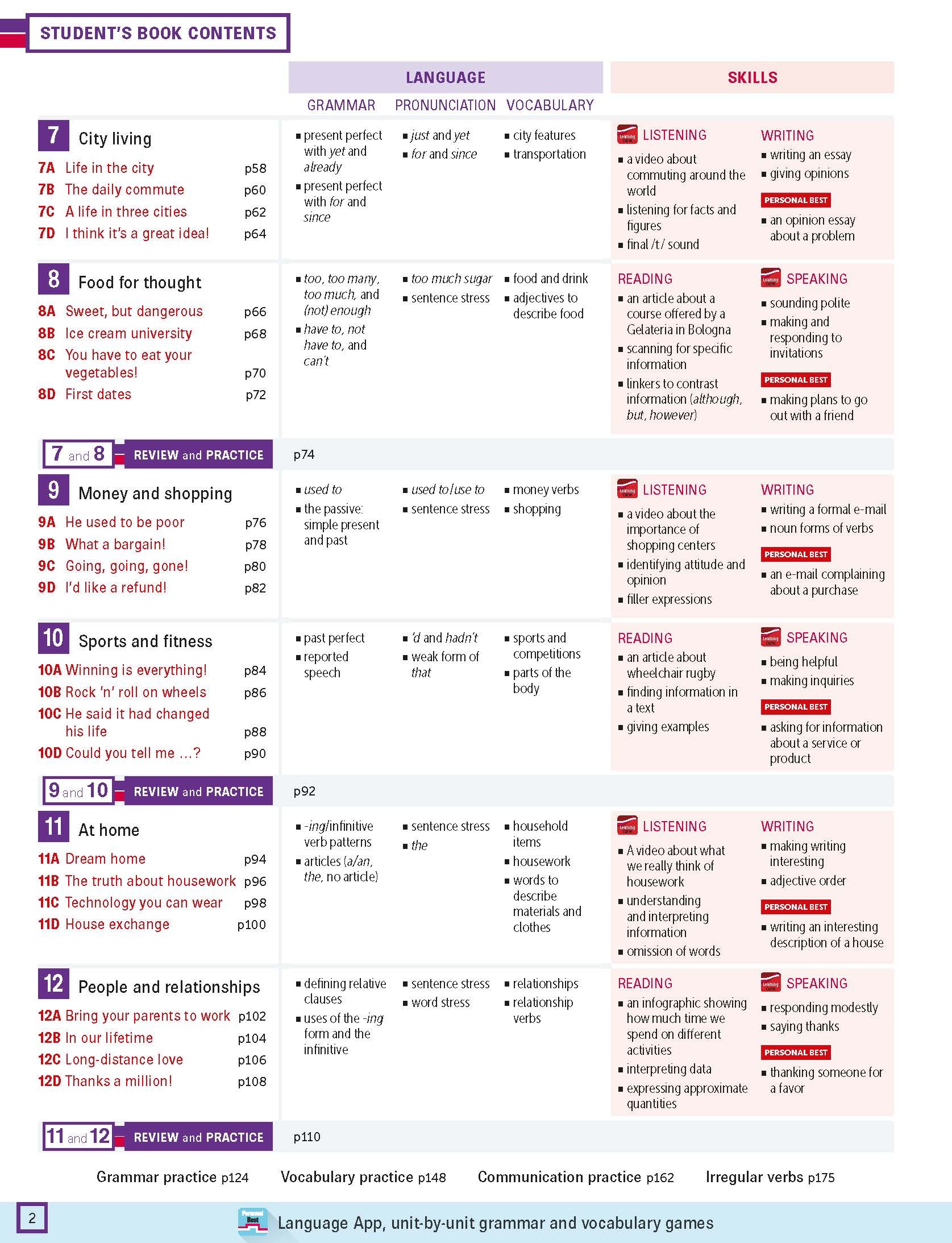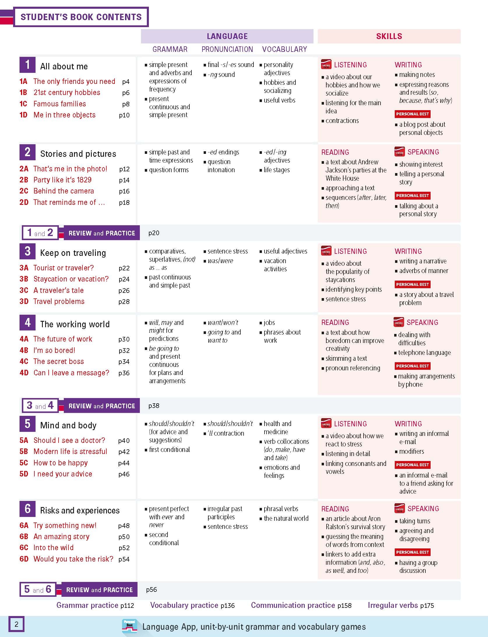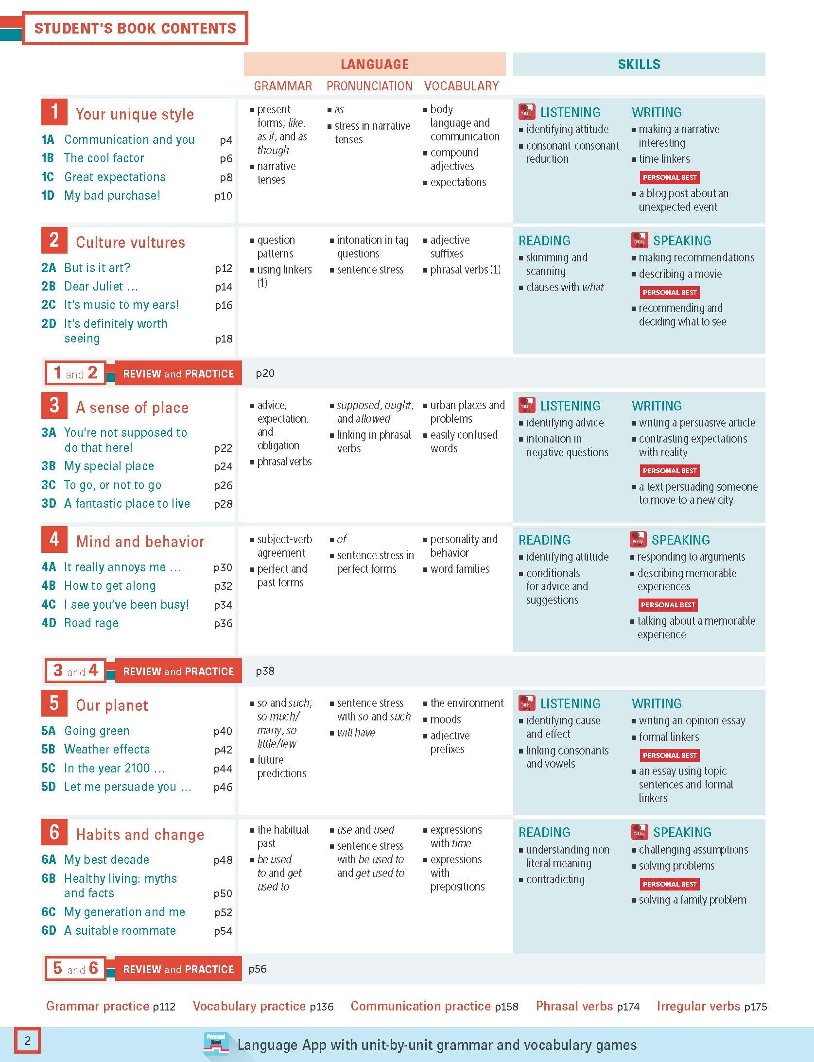 For the breadth of one language point, teachers and students can find the practice exercises in Student’s Book, Workbook, Teacher Resource Pack, Personal Best App