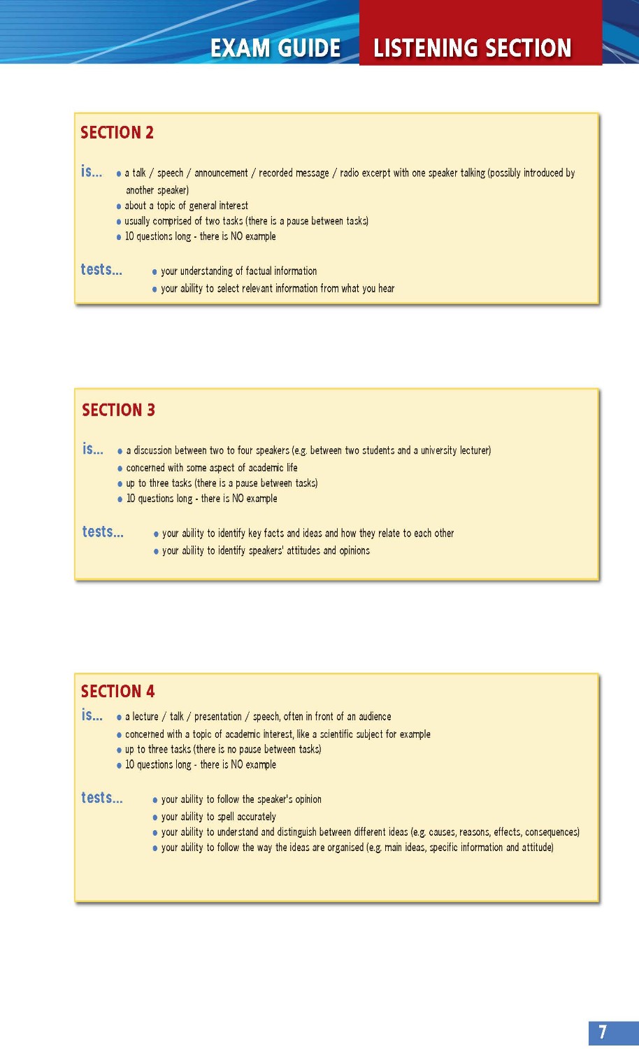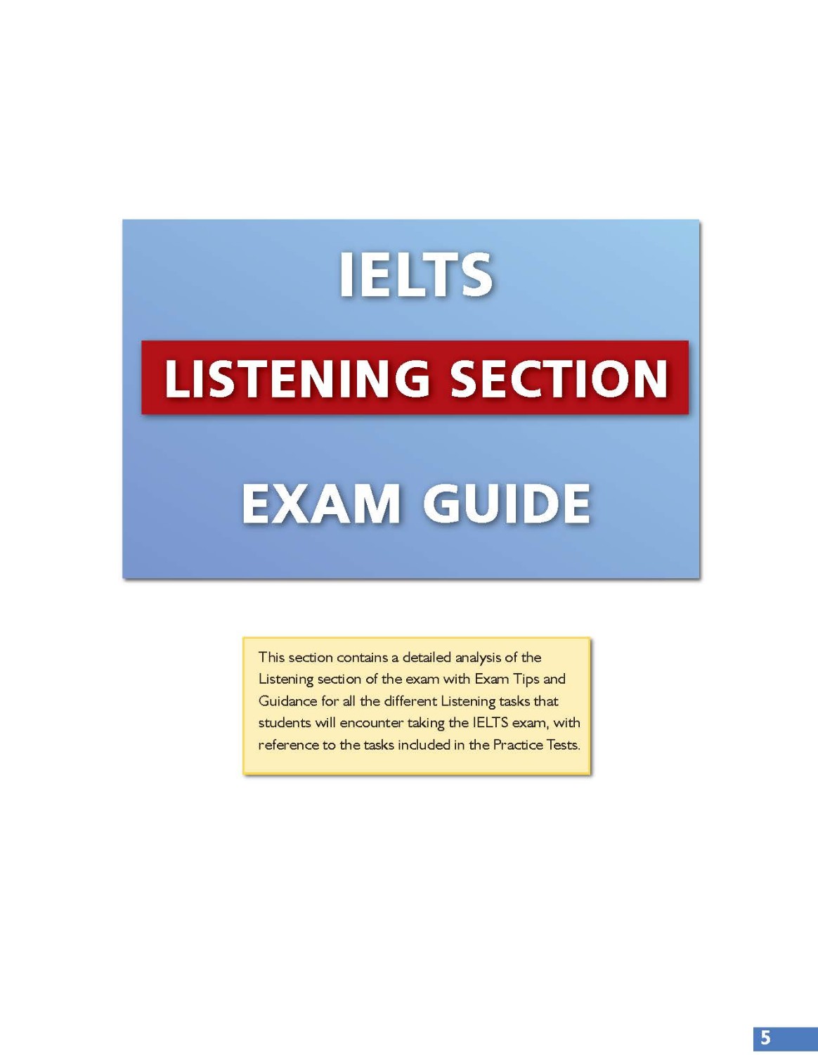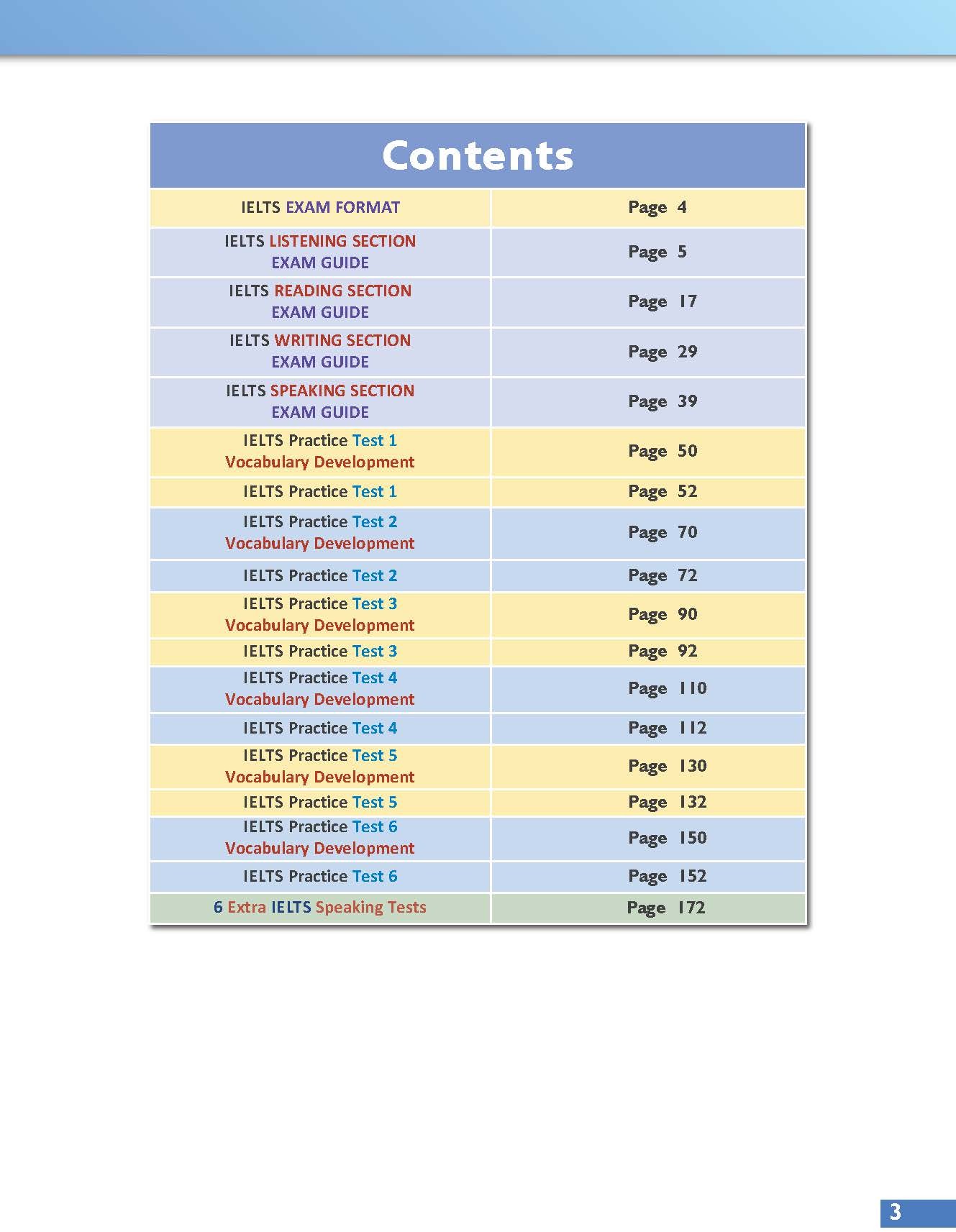Self-study Guide with justification for answers for Listening and Reading; Writing Supplement including model answers and example answers by candidates at varying levels, followed by explanations of the marks awarded; and Audio scripts and answer keys
