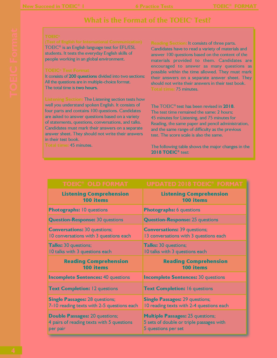 Succeed in TOEIC is specially designed to prepare students for success in the TOEIC Examination, with a focus on achieving scores ranging from 550 to 750 and 650 to 900. The book offers students 6 TOEIC new format Practice Tests (Listening and Reading) per level in colour, including Glossary and Vocabulary Development exercises specifically tailored for Reading Sections 5, 6, and 7, along with strategies and plenty of hands-on practice. Additionally, the comprehensive Self-study Guide offers detailed explanations for each test question. The Online Practice Test App allows students to practise anywhere and at any time.