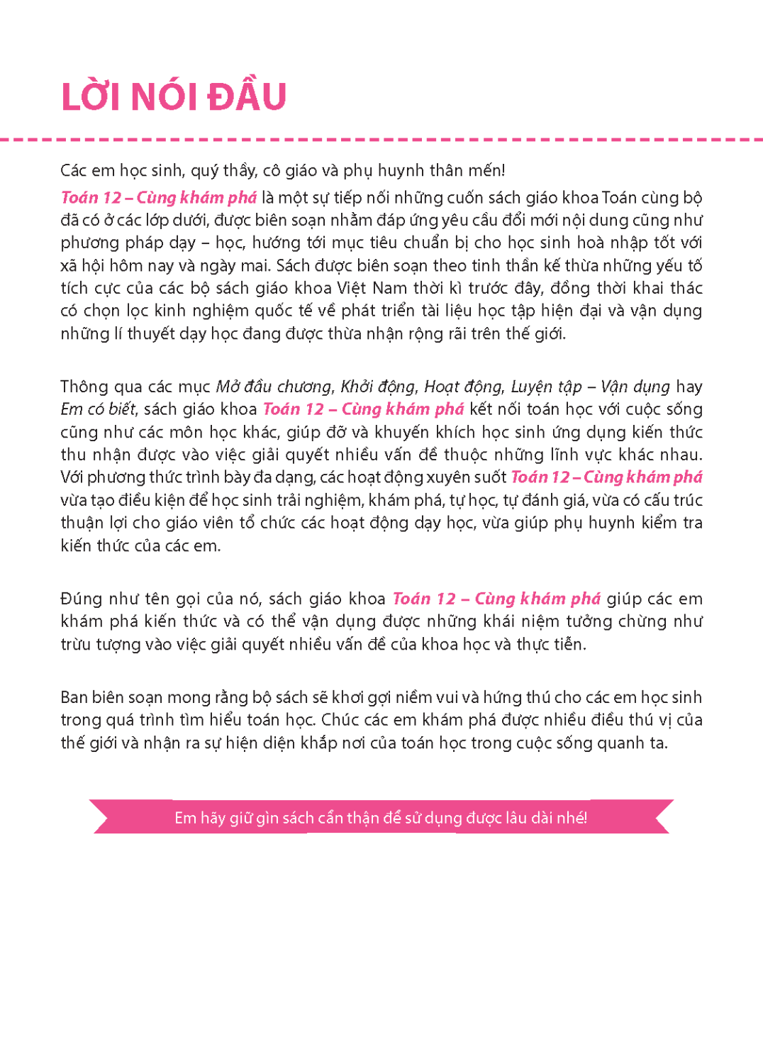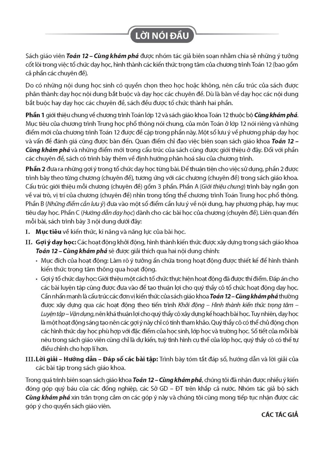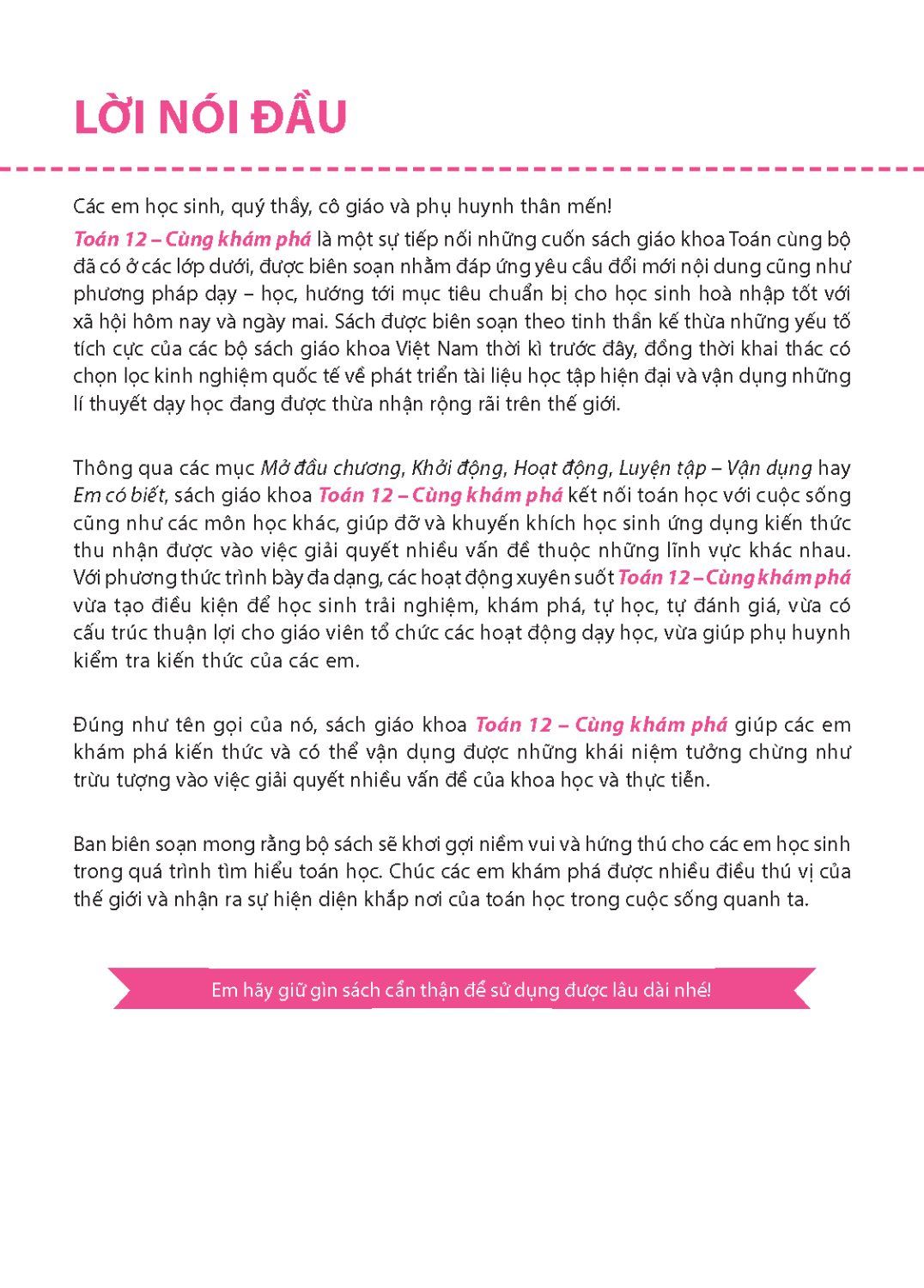 Toán 12 – Cùng khám phá là một sự tiếp nối những cuốn sách giáo khoa Toán cùng bộ đã có ở các lớp dưới, được biên soạn nhằm đáp ứng yêu cầu đổi mới nội dung cũng như phương pháp dạy – học, hướng tới mục tiêu chuẩn bị cho học sinh hoà nhập tốt với xã hội hôm nay và ngày mai.