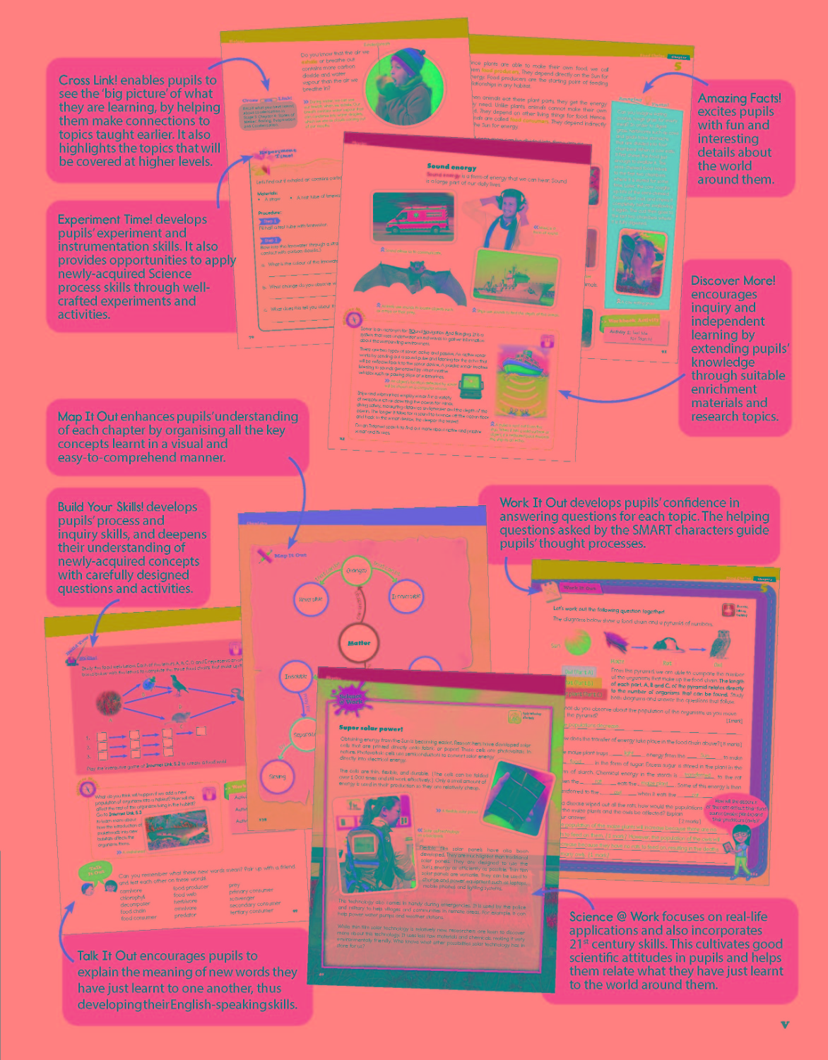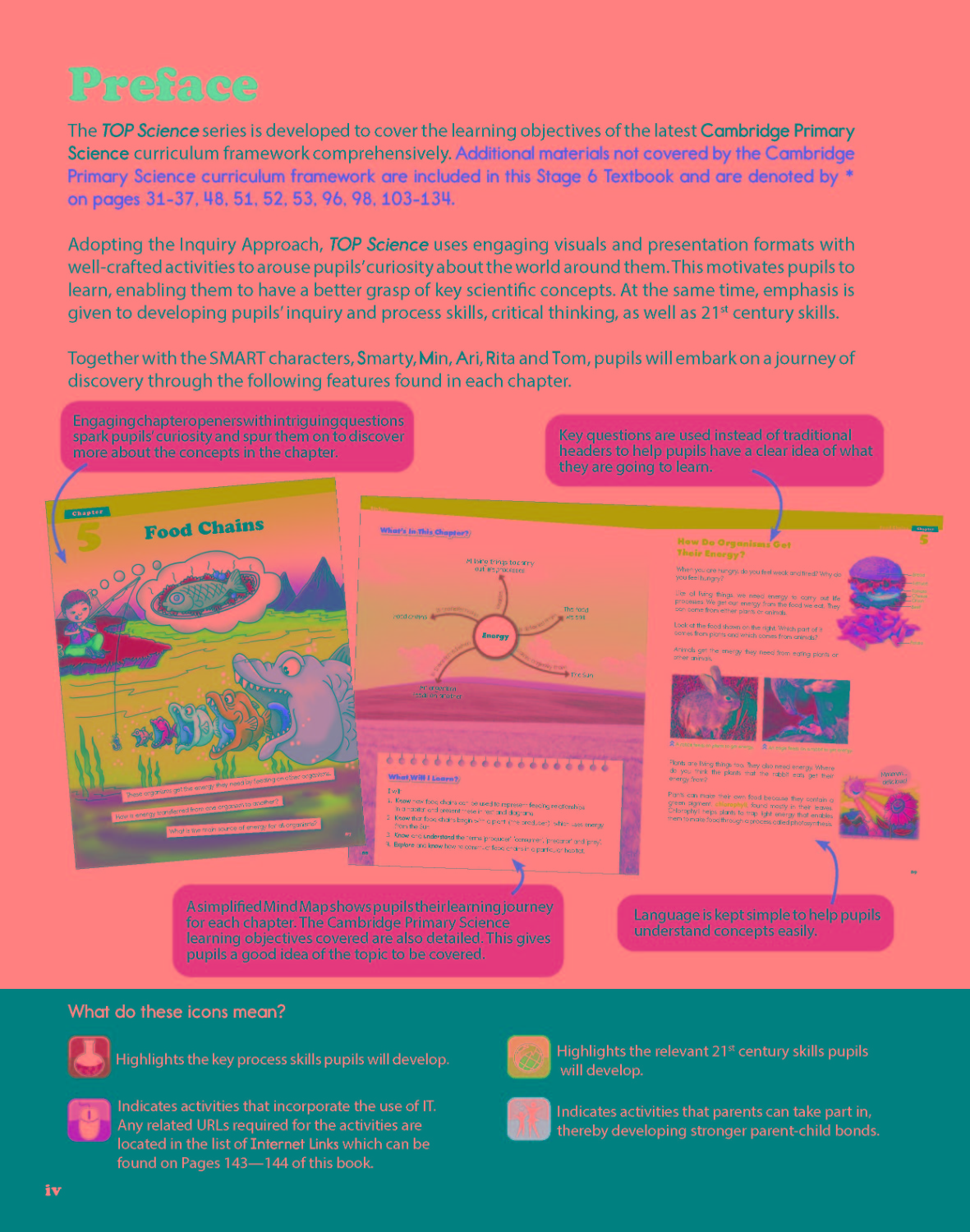 The TOP Science series is developed to cover the learning objectives of the latest Cambridge Primary Science curriculum framework comprehensively. Adopting the Inquiry Approach, TOP Science uses engaging visuals and presentation formats with well-crafted activities to arouse pupils’ curiosity about the world around them. This motivates pupils to learn and enables them to better grasp key scientific concepts. At the same time, emphasis is given on developing pupils’ inquiry and process skills, critical thinking, as well as 21st century skills. TOP Science also develops pupils’ confidence. Questions are provided at the end of every chapter, with advice and helping questions to guide pupils’ thought processes.